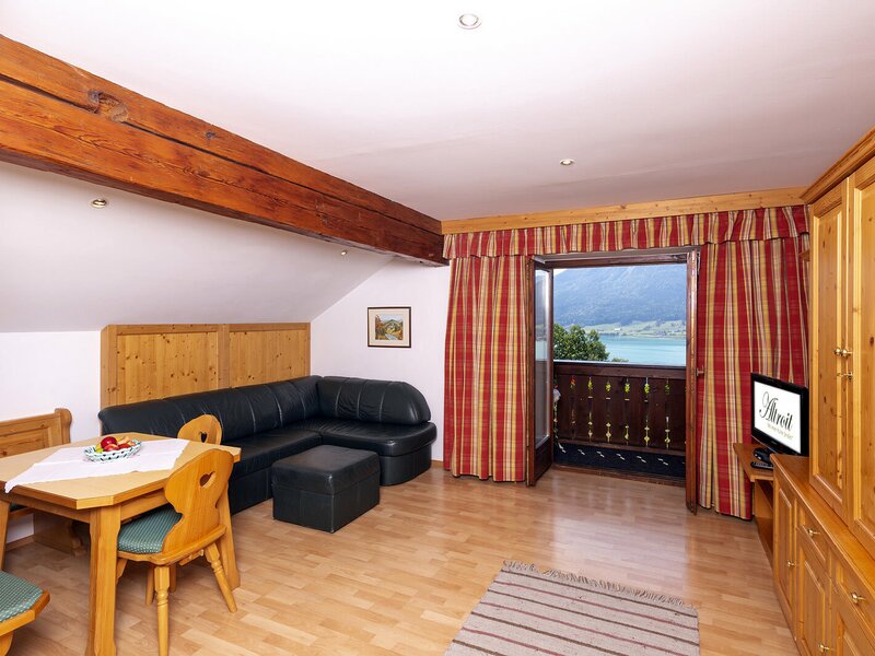 The holiday apartment Sparber (40 m²) facing south (plenty of sunshine) comes with old timber furnishings, a large balcony with rattan furniture overlooking the gorgeous blue waters of Lake Wolfgangsee, the mountains and the prominent church tower of St. Wolfgang. A bathroom incl. wall-mounted radio, toilet and shower. 1 bedroom with box-spring beds, living room with satellite TV. Super fast free Wi-Fi in the house. Our farm Altroiterhof is the ideal starting point for hikes and cycling tours.