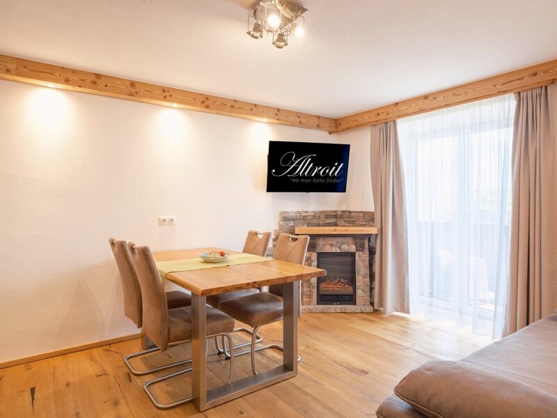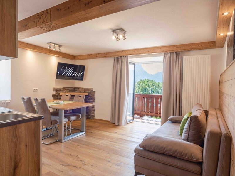 The modern apartment facing south (plenty of sunshine) comes with old timber furnishings, a large balcony with rattan furniture overlooking the gorgeous blue waters of Lake Wolfgangsee, the mountains and the prominent church tower of St. Wolfgang. walk-in shower, toilet, living room/bedroom with box-spring bed, modern kitchen incl. dishwasher (fully equipped), electric fireplace, wall-mounted radio in the bathroom. Separate room with sofa. Super fast free Wi-Fi in the house. Our farm Altroiterhof is the ideal starting point for hikes and cycling tours.