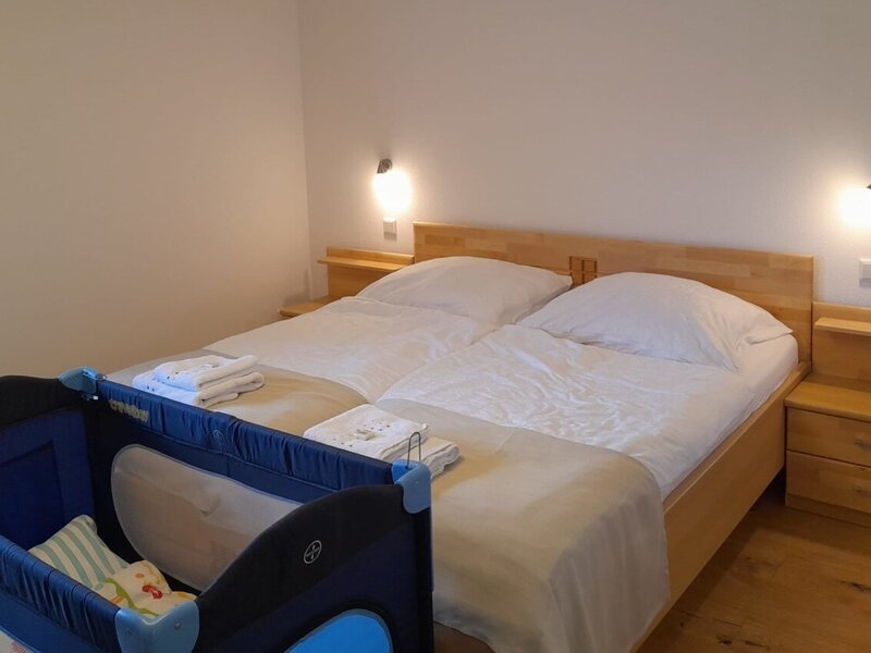 The family room has a living room with kitchen/dining area and a pull-out couch for 2 persons, a bathroom/WC, a bedroom with double bed and enough space for a cot. Enjoy the beautiful view of our orchard, meadows, poppies and grandma’s garden. It really makes you calm down. The morning sun guarantees a happy start of the day. The family room is located on the 2nd floor (elevator).