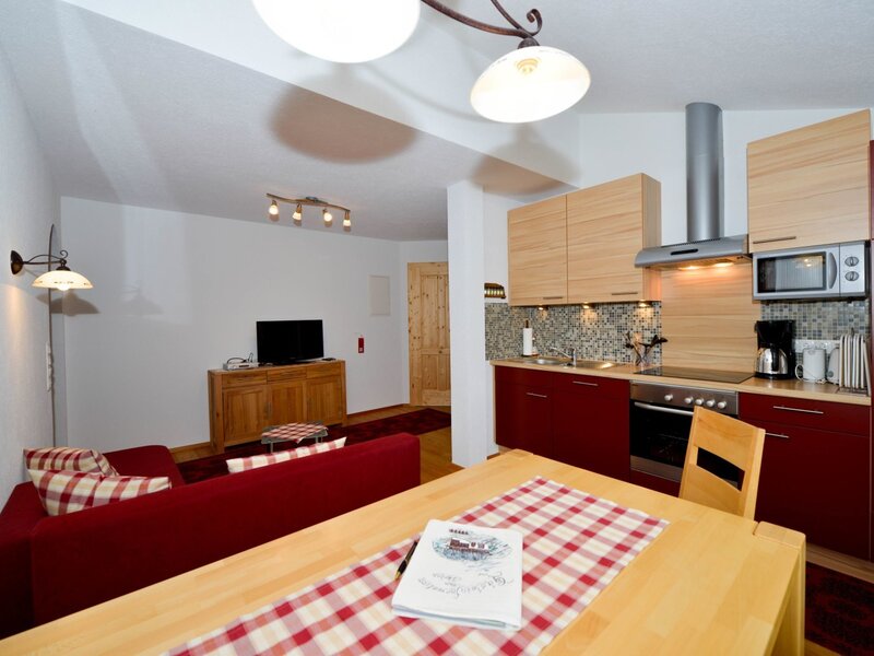 The Dorfblick holiday apartment faces west and consists of a double room with balcony, another double room with an additional bed for small children, a combined living room/kitchen with a dining table and couch and chairs with TV, a WC and a shower/bath with window. Furthermore, there is a washing machine, heated towel rail, vanity mirror and hairdryer. On request, wireless Internet access is available.