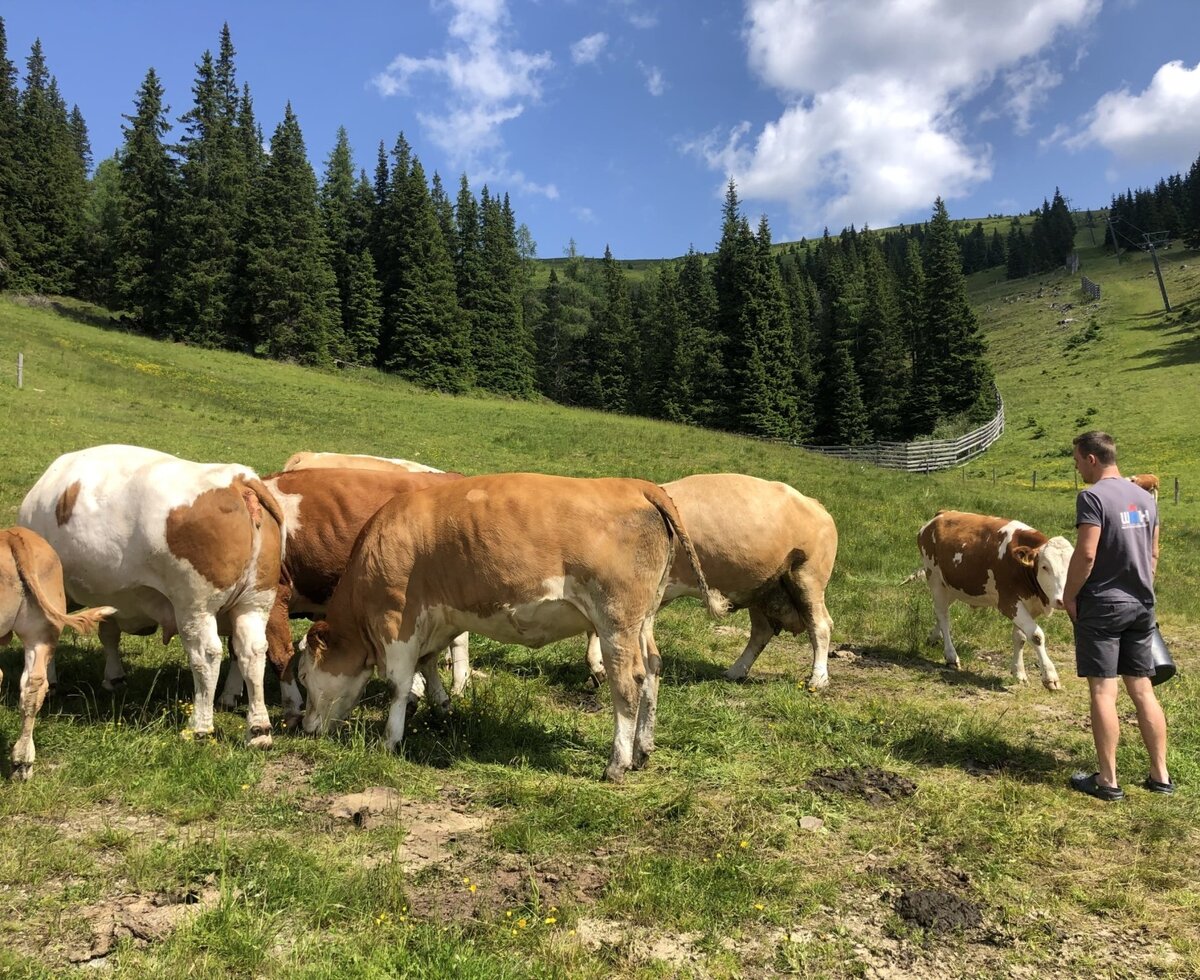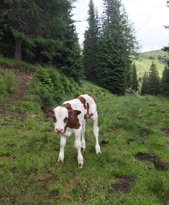 Our organic farm is located about 5 kilometers away in the valley, on the Hochegg. Three horses, three dwarf goats, 5 chickens and 4 cats live on our farm. Around our alpine huts graze in summer about 10 suckler cows with their calves and bull Bullux.