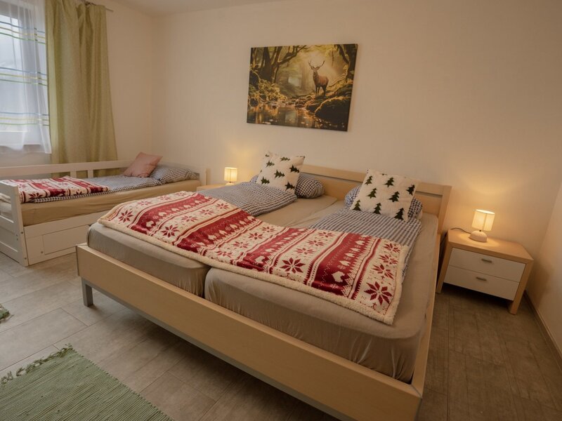 Ein paar Schritte weiter erwartet dich das Schlafzimmer mit einem Doppelbett und einem Einzelbett sowie einem Fernseher. Der Raum wirkt ruhig und geborgen, ein Platz für erholsame Nächte und schöne Träume.