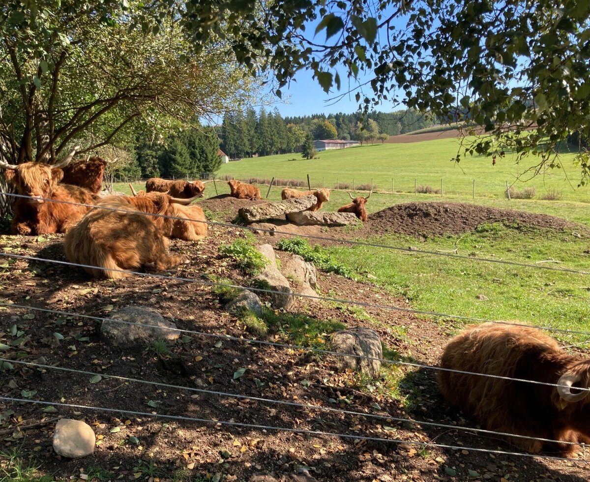 Unsere Hochlandrinder und Schafe auf der Weide beobachten und unsere Zwergziegen in ihrem Gehege besuchen.