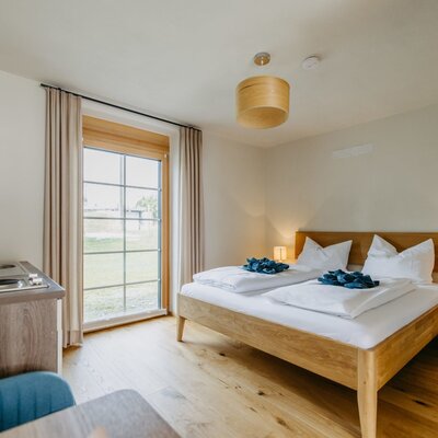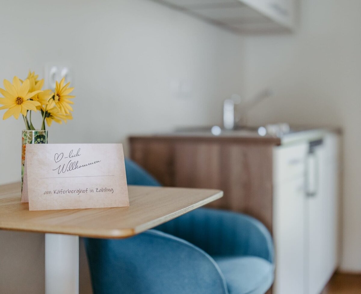 Im Zimmer wurden hochwertige, natürliche Materialien verbaut. Lehmputz, Echtholzparkettboden, Vollholzmöbel und Travertinfliesen schaffen eine traumhafte und wohlige Atmosphäre. Die 36 m², für 4 Personen, verfügen über ein Doppelbett (180 cm) und ein Etagenbett / Stockbett (90 cm), Bad mit WC, Kochfeld, Kühlschrank, Geschirrspüler, Schwedenofen, Tisch, Sitzbereich, Stauraum (Ablage- und Aufhängemöglichkeiten) und Terrassenbereich ca. 12m² mit Tisch und Sitzgelegenheit. Das Etagenbett / Stockbett befindet sich in einem eigenen Zimmer. Das Zimmer kann mit Raffstore, Vorhängen und Plissee verdunkelt werden. Ein Babybett kann auf Wunsch zur Verfügung gestellt werden. Nächtigung und Frühstück ist kostenlos für Kinder bis 4 Jahre. Die Zimmer wie auch die Landschaft laden zum "Digital-Detox" ein. Am Käferberghof gibt es bewusst keine Fernseher.