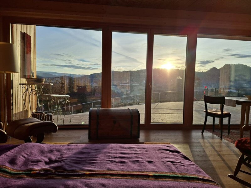 Our Apartment Panorama offers a spacious room and a terrace/winter garden with panoramic views of Lake Längsee, St. Georgen Abbey, and the surrounding rolling mountains. It combines coziness, comfort, and privacy with a view and ambiance. A bedroom with a large pine double bed, a bathroom with a walk-in shower, and a fireplace in the living room, which also has a single bed, create a cozy atmosphere. The kitchen is fully equipped. Enjoy the view from the caravans to the Saualpe!