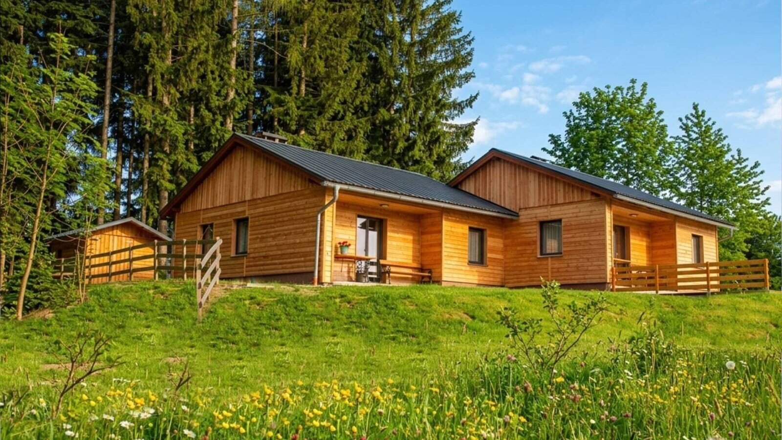 Mitten auf einer sonnigen Waldlichtung erwartet dich die Langhanshütte, ruhig gelegen und umgeben von Wiesen und Wäldern. Auf 57 m² finden bis zu 6 Personen ausreichend Platz für entspannte Urlaubstage mit Familie oder Freunden.
