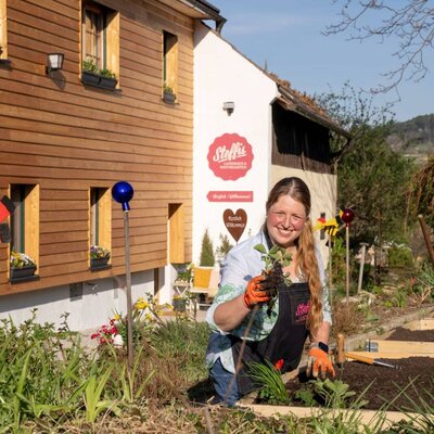 Ich bin die Steffi, wohne nebenan im Landhaus, arbeite gerne als Gastgeberin, Naturpädagogin, Eventplanerin, Hobbyköchin und -gärtnerin und sorge nicht nur für meine Gäste, sondern auch für den idyllisch gelegenen Landgarten. Im Laufe der Jahre gestalte ich den Rasen- und ehemaligen wilden Weingarten in ein Naturparadies für Vögel, Insekten, kleine und große Naturinteressierte um. In den Ferien veranstalte ich Naturcamp-Wochen vom 20.7. - 21.8.2026 und lade interessierte Kids ein, die Ferien im Naturgarten zu verbringen und viele Abenteuer zu erleben. Weitere Informationen gibt es unter www.steffisnaturgarten.at.