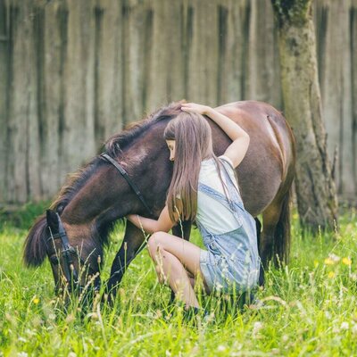 - 1 Shetland-Pony „Stella“, schokobraun und 15 Jahre alt, mit dem auch spazieren gegangen werden kann, sehr verschmust und immer für einen Schabernack zu haben.