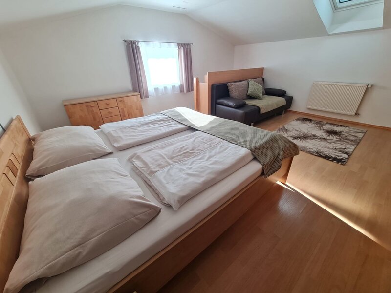 Die Hof-Ferienwohnung bietet ein gemütliches Ambiente für bis zu 4 Personen und ist ideal für Familien, die viel Raum und Komfort suchen. Ein Doppelbett für 2 Erwachsene sowie ein Stockbett für 2 Kinder sorgen auf zwei Etagen für erholsame Nächte und ein entspanntes Miteinander.
