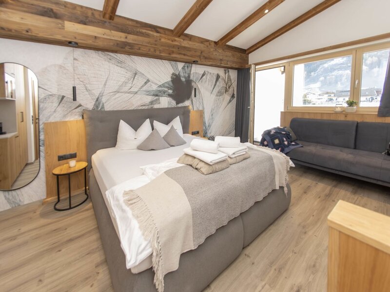 A stylish bedroom and an elegant bathroom with shower and hairdryer provide everything you need for relaxing days. From the spacious east-facing balcony with a private sauna, you can enjoy magnificent views of the Zillertal mountain landscape – perfect for your first coffee in the morning or peaceful evenings.