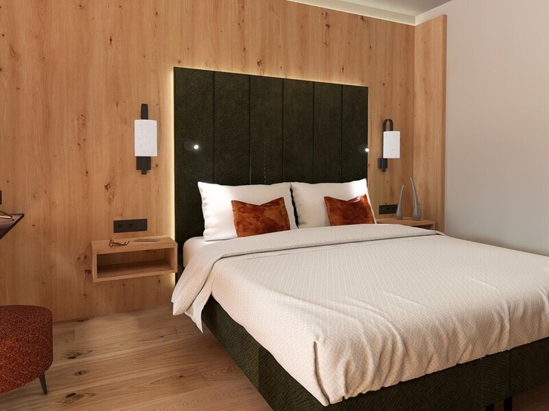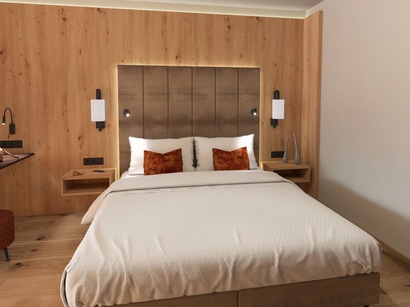 Our newly designed double rooms combine modern Alpine style with natural coziness. High-quality natural materials, warm colours, and a comfortable double bed ensure a restful sleep. A cozy seating area, modern air conditioning, cable flat-screen TV, complimentary high-speed Wi-Fi, as well as a minibar and kettle, provide additional comfort. The modern bathroom with a spacious shower completes the living experience. A balcony or loggia with a beautiful view invites you to relax and unwind.