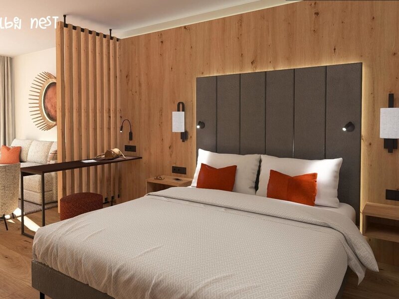 Our spacious Family Studio offers plenty of room for unforgettable holiday moments with the whole family. Two separate bedrooms ensure privacy for everyone, while the stylish natural design with plenty of wood creates a warm and welcoming atmosphere with a touch of refined comfort. Comfortable beds, stylish seating, modern air conditioning, two flat-screen cable TVs, free high-speed Wi-Fi, as well as a refrigerator and kettle provide everything you need for a truly relaxing stay. The elegant bathroom with a refreshing shower and the loggia with stunning views of the natural pond and the surrounding mountains make the Family Studio an ideal retreat for families who value peace, nature, and a sense of cosy comfort.