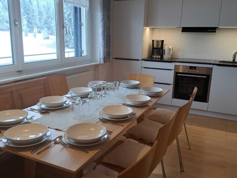 From the balcony, you can watch the children swinging or playing in the sandpit. The apartment offers beautiful views in all directions. The apartment is appointed with two newly renovated shower, one bath tub and two WCs.