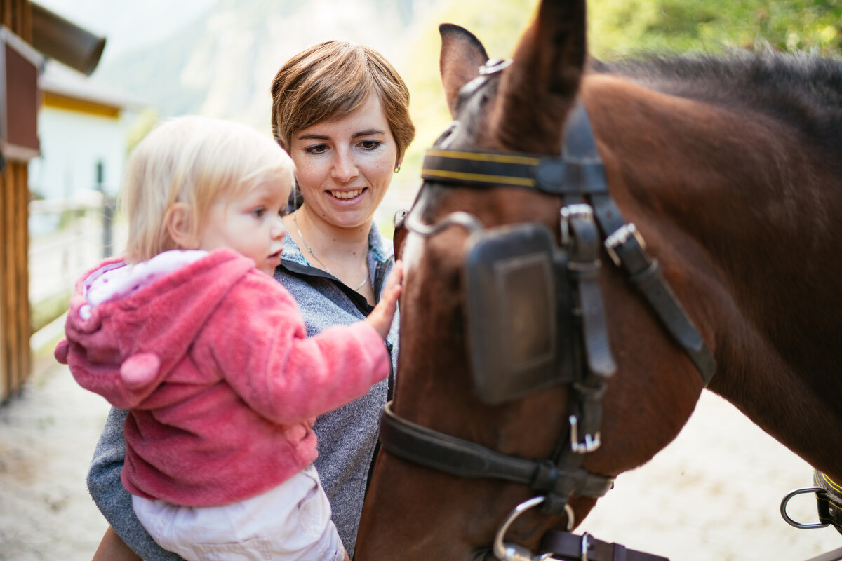 Today, the 27-year-old is a certified riding instructor and trail ride guide. She particularly likes taking care of the youngest guests. At the tender age of three, the kids can get in touch with the animals. In small groups of max. three or four children, they are sitting on a pony for ten minutes each. This way, they are learning through play. Without a saddle, by the way. “This is an amazing experience for toddlers and children.” The German Riding Pony is very affectionate, that’s one of its characteristic traits. This is why it can be handled by children of all ages. “Children instantly find a pony that suits them. It’s great to watch them being in tune with each other.” The horses also seem to like it. “At times they even re-discover their ‘inner child’, feeling more relaxed, the more playful the kids are”, Barbara says. Also advanced riders will find what they’re looking for on the horse farm “Pferdehof Alpenrose”. There’s no better way to explore the Brandnertal valley than the weekly rides where the horses can use their various gaits.